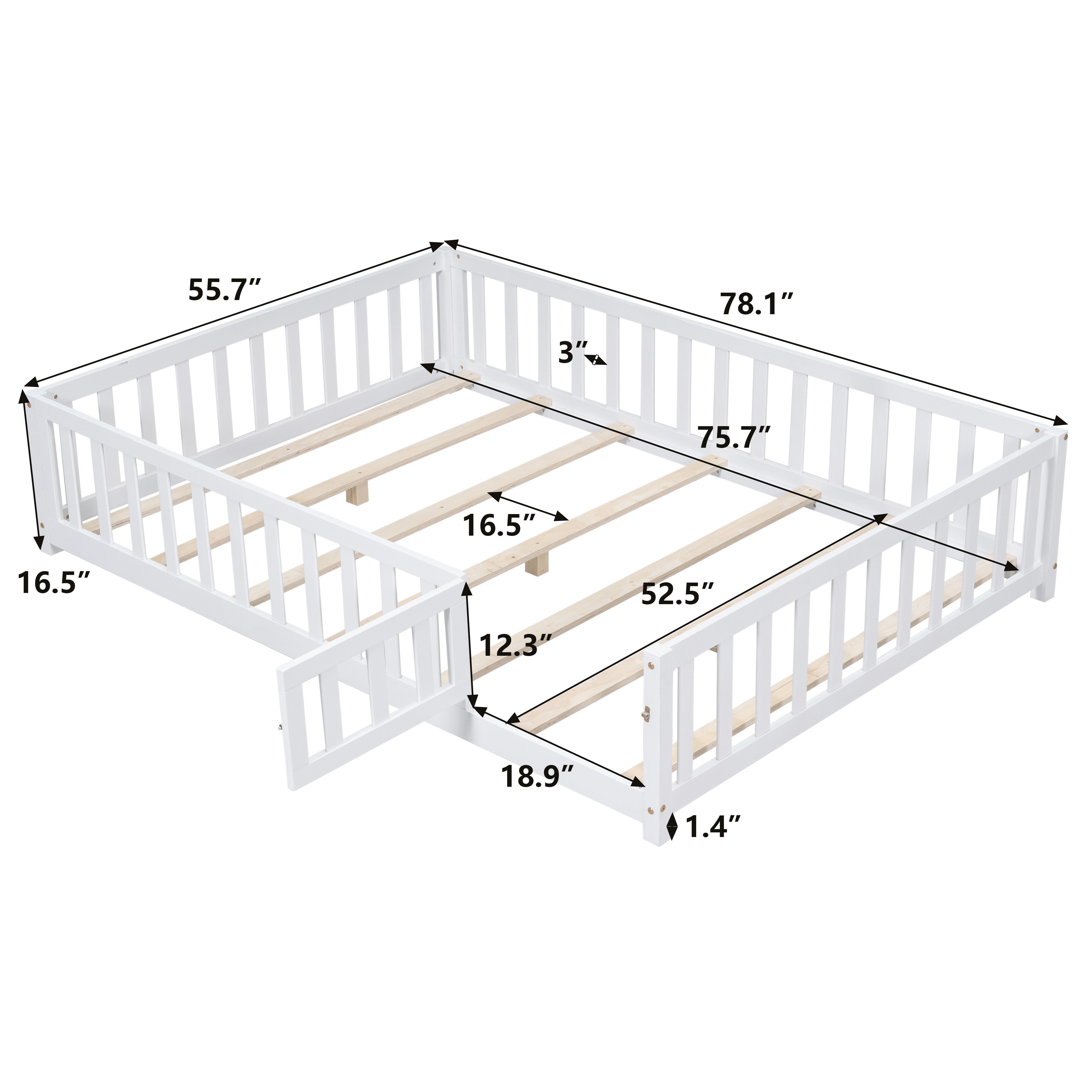 Home > Full Size Floor Platform Bed with Fence and Door for Kids, Montessori Floor Bed Frame with Support Slats for Toddlers, Wooden Floor Bed White