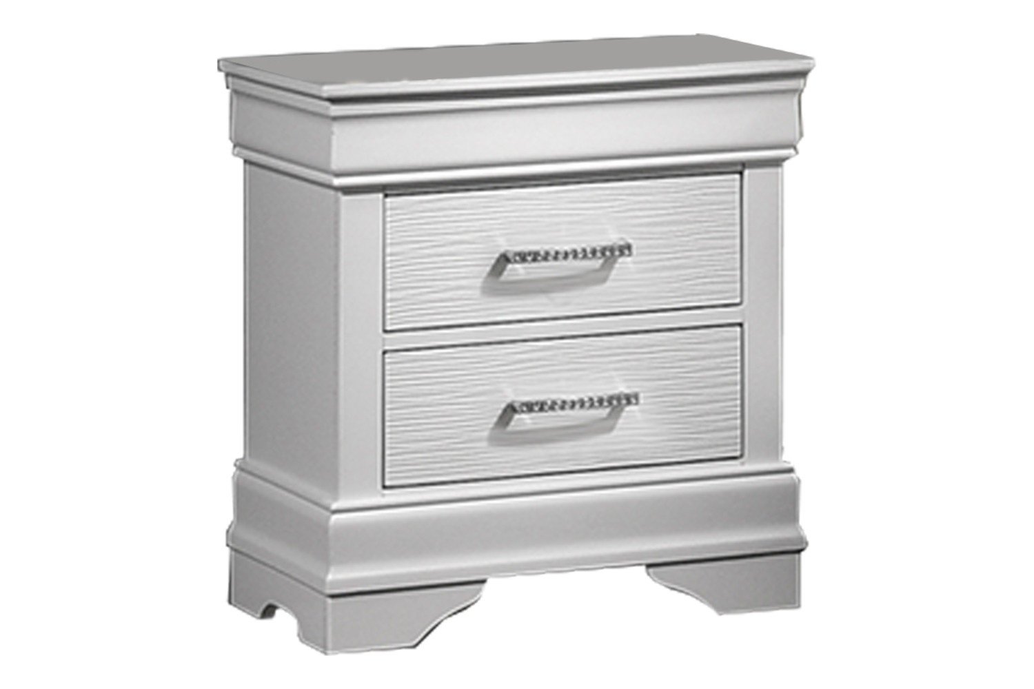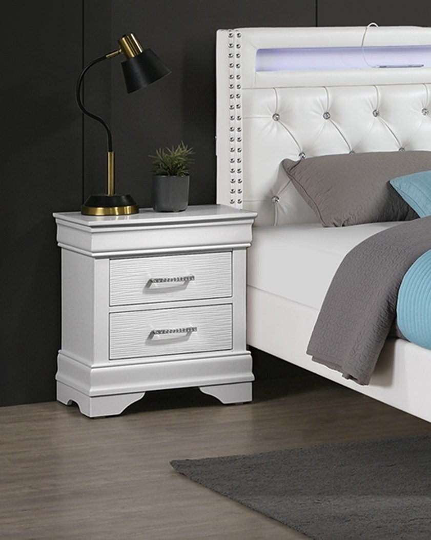 Description :-Designed to complement both modern and classic interiors, this nightstand is crafted to provide ample bedside storage while elevating your space with luxurious details. The two spacious drawers offer plenty of storage for your nighttime essentials, from books and reading glasses to chargers and personal items. The drawers are adorned with small diamond-accented handles, adding a subtle yet dazzling touch that catches the light beautifully, enhancing the overall elegance of the piece. For a coordinated and polished look, pair this stunning nightstand with the matching dresser, mirror, chest, and bed, each sold separately. Listing Includes - 1pc Nightstand Only. BED, DRESSER, MIRROR AND CHEST - NOT INCLUDED.Dimensions - 21" x16" x 24"H Materials - Solid wood Frame / MDF Drawer Box. Simple Assembly requires.Features-• Features two spacious drawers for convenient bedside storage.• The sleek and refined silhouette of this nightstand makes it a stunning addition to any bedroom.• The dazzling drawer handles adorned with small diamond-like embellishments, adding a touch of glamour and luxury to your space.