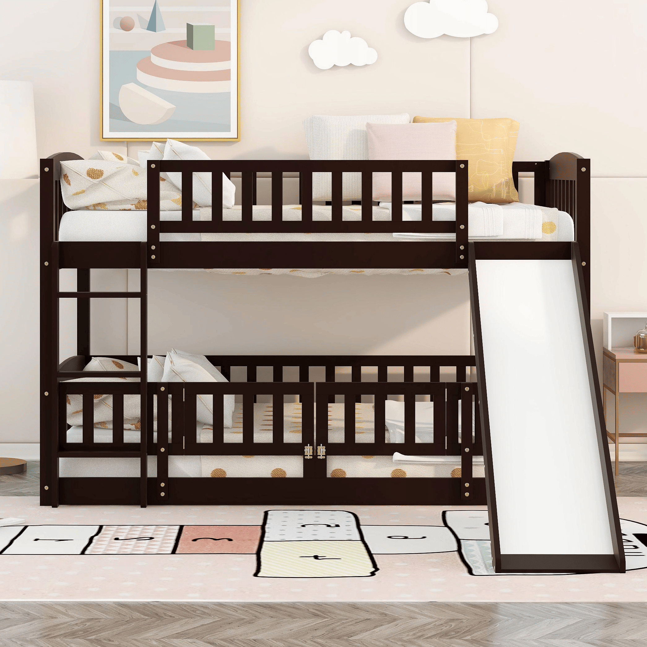 This low bunk bed with slide is designed with a clean silhouette and a hue of elegance.
