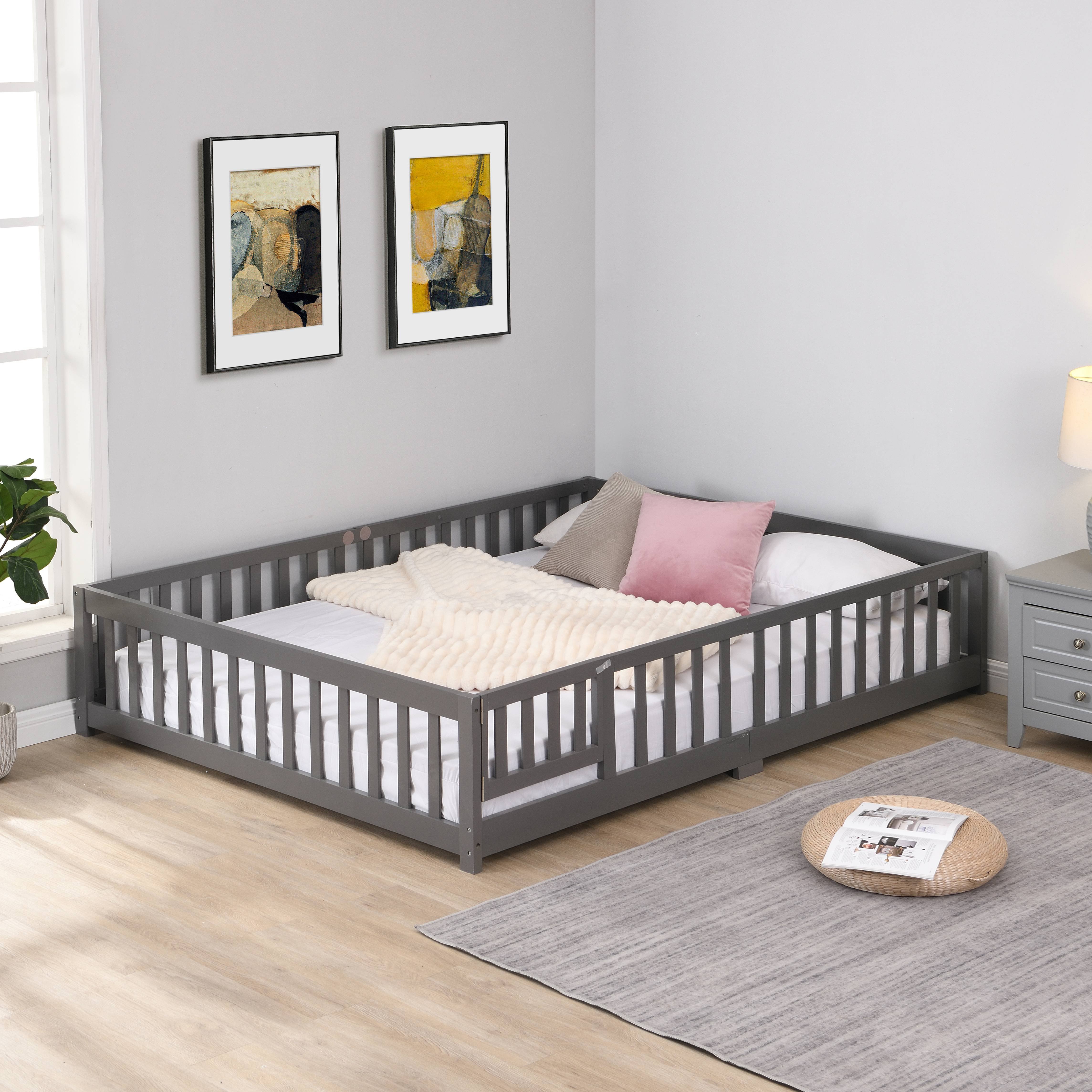 Floor Bed with Safety Guardrails: The toddler's floor bed, positioned close to the ground with surrounding solid wood safety guardrails and a low-profile design, ensures enhanced safety within their sleeping environment.