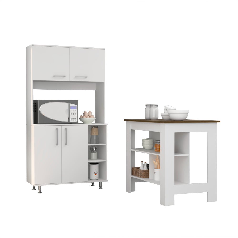 Looking for a fantastic new kitchen or just the perfect addition to your home? Look no further than the Surrey Kitchen Set! This gorgeous set, designed with exclusive white-walnut manufactured wood, is perfect for any home. It includes the Brooklyn kitchen island, ideal for entertaining guests or preparing large meals, and a beautiful pantry perfect for storing all your kitchen essentials. With its ingenious design and elegant white-walnut finish, the Surrey Kitchen Set is sure to become the centerpiece of your home.This stylish island is perfect for any kitchen, with a large top surface (40,5 "W X 27,5 "D) perfect for meal prep or entertaining. The white-walnut finish is easy to care for and will make your kitchen look its best. The modern style impresses your guests, and the three spacious lower shelves provide plenty of storage space.We know how important it is to have a functional and stylish kitchen, so we're excited to offer the Colorado Pantry Cabinet. This piece is essential for any kitchen, and it's gorgeous. This pantry is ingeniously designed and will make a beautiful addition to your kitchen. The wide surface (15,7") is perfect for your microwave, and the double-door upper cabinet (15,8"H X 17,7"W) provides ample storage space. The lower cabinet also has double doors and internal storage, plus three open shelves on one side.Dimensions:Furniture 1, Brooklyn Kitchen Island Width: 40,5'Height: 35,4'Depth: 27,5'Furniture 2, Colorado Pantry Cabinet Width: 37,4'Height: 70,9'Depth: 15,7'