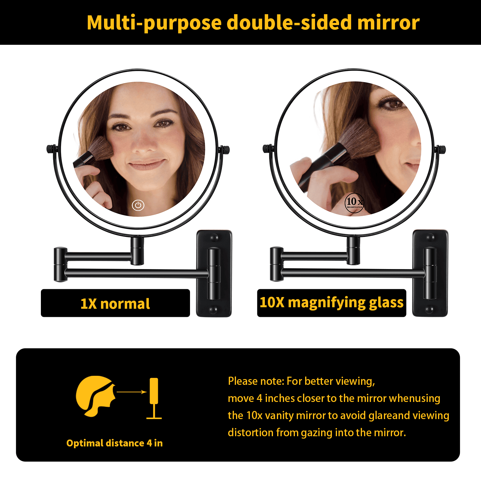 Double Side 1X/10X : The mirror have double side,1X normal magnifying mirror and 10x magnifying mirror that can allow you to see clearly your Every facial features tweezing.Tips:When using a 10x magnifying mirror, keep within 4 inches distance to avoid dizzy.