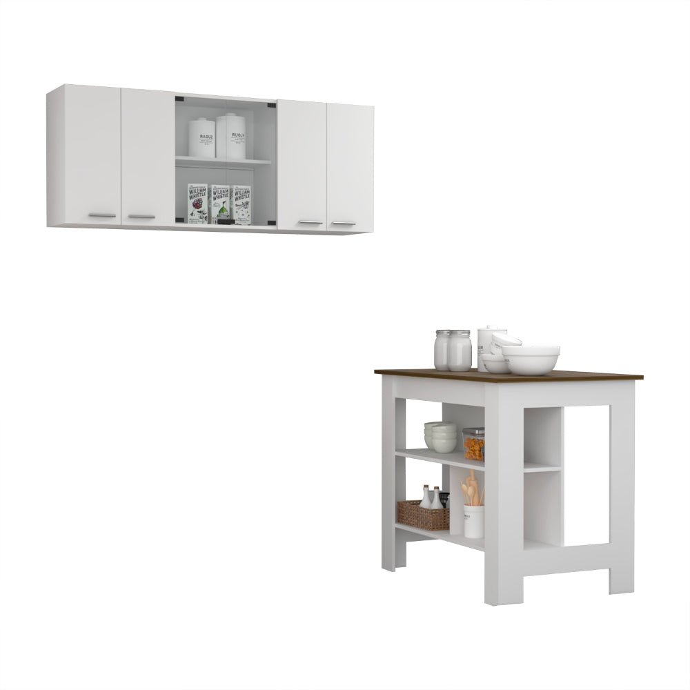 Norfolk 2 Piece Kitchen Set, Kitchen Island + Upper Wall Cabinet , White /Walnut